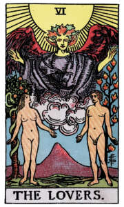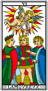 Más adelante, en el Tarot de Marsella, el Arcano aparece como “El Enamorado”, representando a un individuo que toma la decisión de crear un vínculo, quizás reflejando un poder más masculino, dado que el personaje central es un hombre. Con el tiempo, esta imagen se transformó en “Los Enamorados”, un arcano plural, donde el amor ya es una cuestión de dos.
