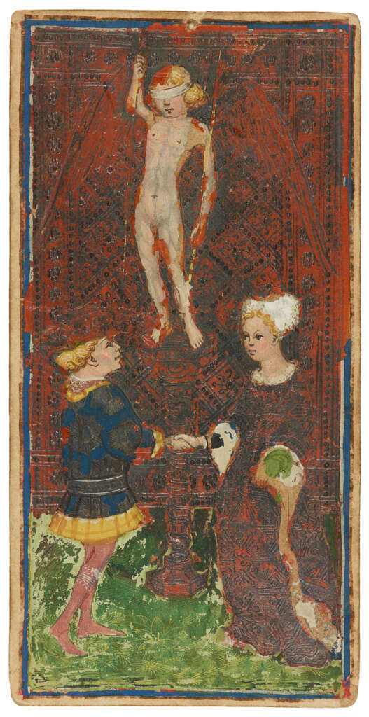 Quiero destacar también la evolución del carácter individualista del amor en el Tarot. Como hemos venido comentando, este Triunfo se llamaba originalmente “El Enamorado” o “Amor”, y en algunos de los primeros mazos, como el Tarot de Visconti, la escena parece representar el matrimonio entre Bianca Maria Visconti y Francesco Sforza, un evento político muy importante en Milán en el siglo XV. El significado principal de esta carta era, por tanto, la unión conyugal y la fidelidad.